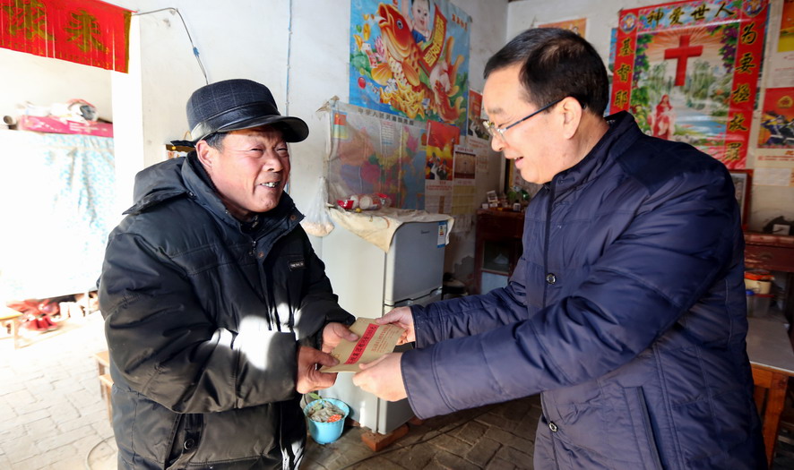 1月20日上午,集團(tuán)公司總經(jīng)理胡建明代表集團(tuán)黨委專門(mén)來(lái)到對(duì)口扶貧點(diǎn),贛榆區(qū)沙河鎮(zhèn)北朱果村走訪慰問(wèn)貧困戶。在沙河鎮(zhèn)人大主席曹軍華的陪同下,胡建明共看望了十戶貧困戶,每到一家,都關(guān)切地詢問(wèn)他們生產(chǎn)生活狀況和遇到的困難,勉勵(lì)他們堅(jiān)定信心,樹(shù)立戰(zhàn)勝困難的勇氣,并為他們送去慰問(wèn)金和節(jié)日的祝福。