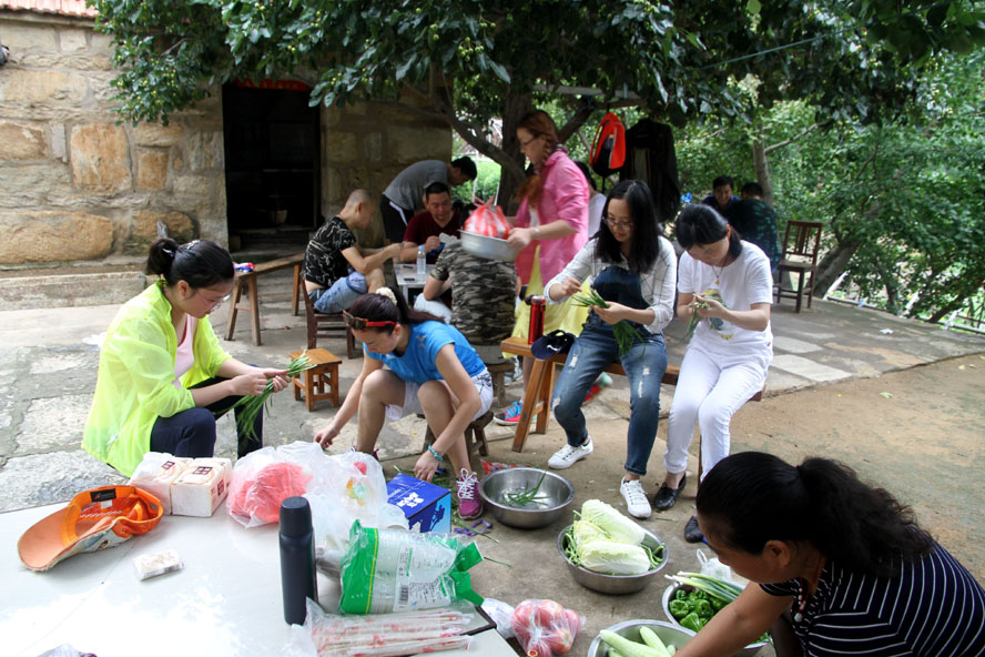 這處清幽潔凈的農家小院成了隊員大展廚藝的用武之地,大家迅速整理好自帶的蔬菜食物,按各自特長分好工。有清理蔬菜的、有和面的、有刷鍋燒水的,那些實在幫不上忙的便湊到一起圍坐在院中的樹蔭下開始“摜蛋”比賽。廚房中,面對農戶家中的那兩口大草鍋,負責炒菜的隊員直撓頭,因為在城里實在是無處尋覓這樣的鍋灶了,更不知該如何才能把這灶火燒得旺旺的。這時我們的女隊員劉惠自告奮勇,勇敢地擔起了“伙頭軍”的重任。還別說,在經(jīng)過戶主老大爺?shù)囊环更c后,一會兒功夫這灶火便被她燒得有規(guī)有距起來。很快,灶房便飄出了炒肉、煎蛋的香味。此時,院中也已擺起了包旱餃的陣式來了。面已和好,兩種口味的餡料也已備好。有負責搟餃子皮的,有負責包餃子的,隊員們賽速度、賽質量,兩種口味的餃子被分別擺放在各自的簸箕里。看著形態(tài)各異的餃子,大家忍不住評價起來,最終有隊員被冠上了“專業(yè)面點師”的雅號。人多力量大,當所有的菜肴、面點擺到長桌上時,大家開心不已,雖然這算不上美味佳肴,但自己的勞動果實卻總是最美味。