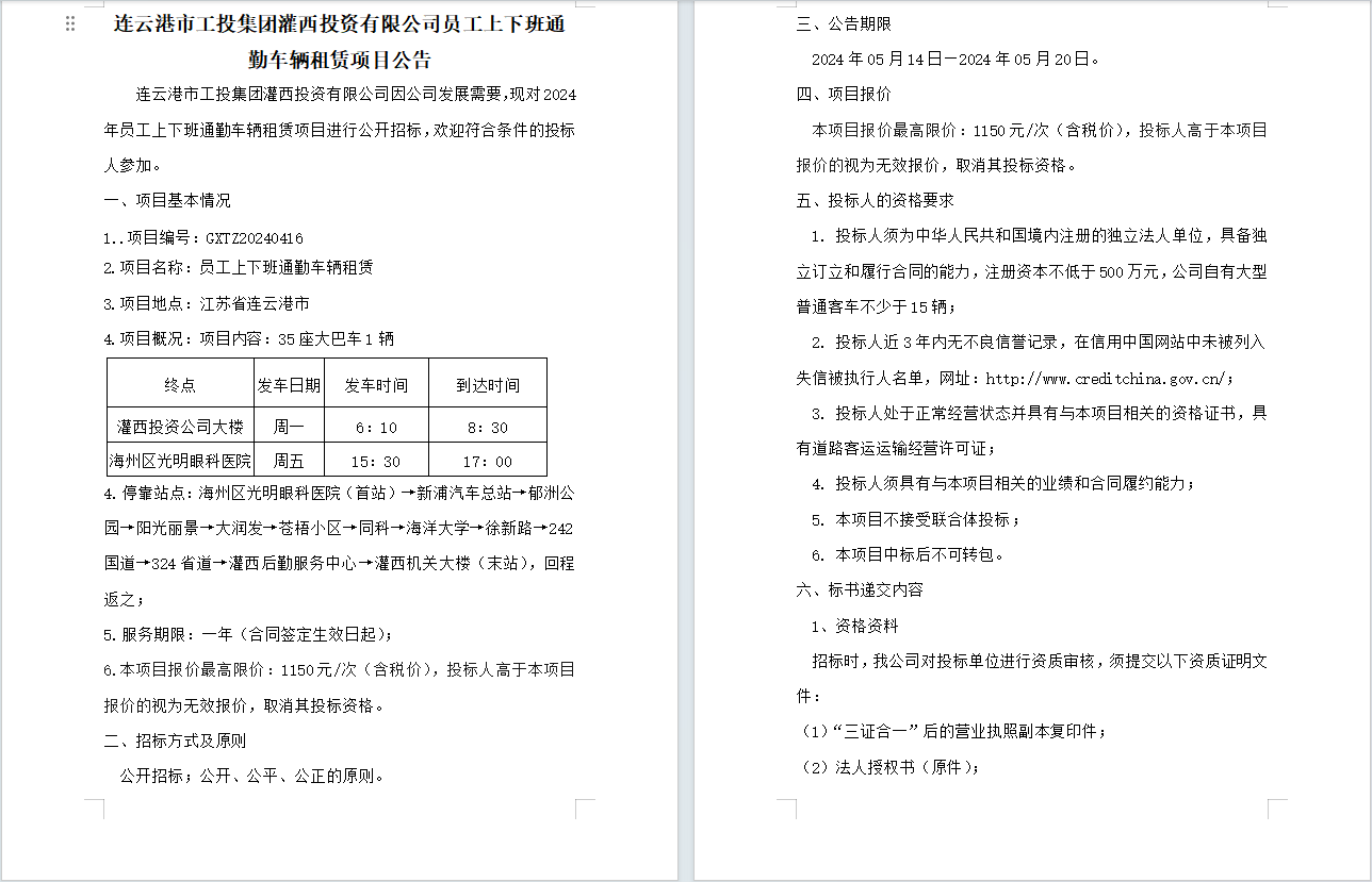 連云港市工投集團(tuán)灌西投資有限公司員工上下班通勤車輛租賃項目公告