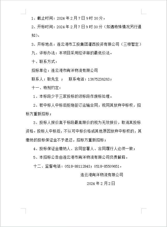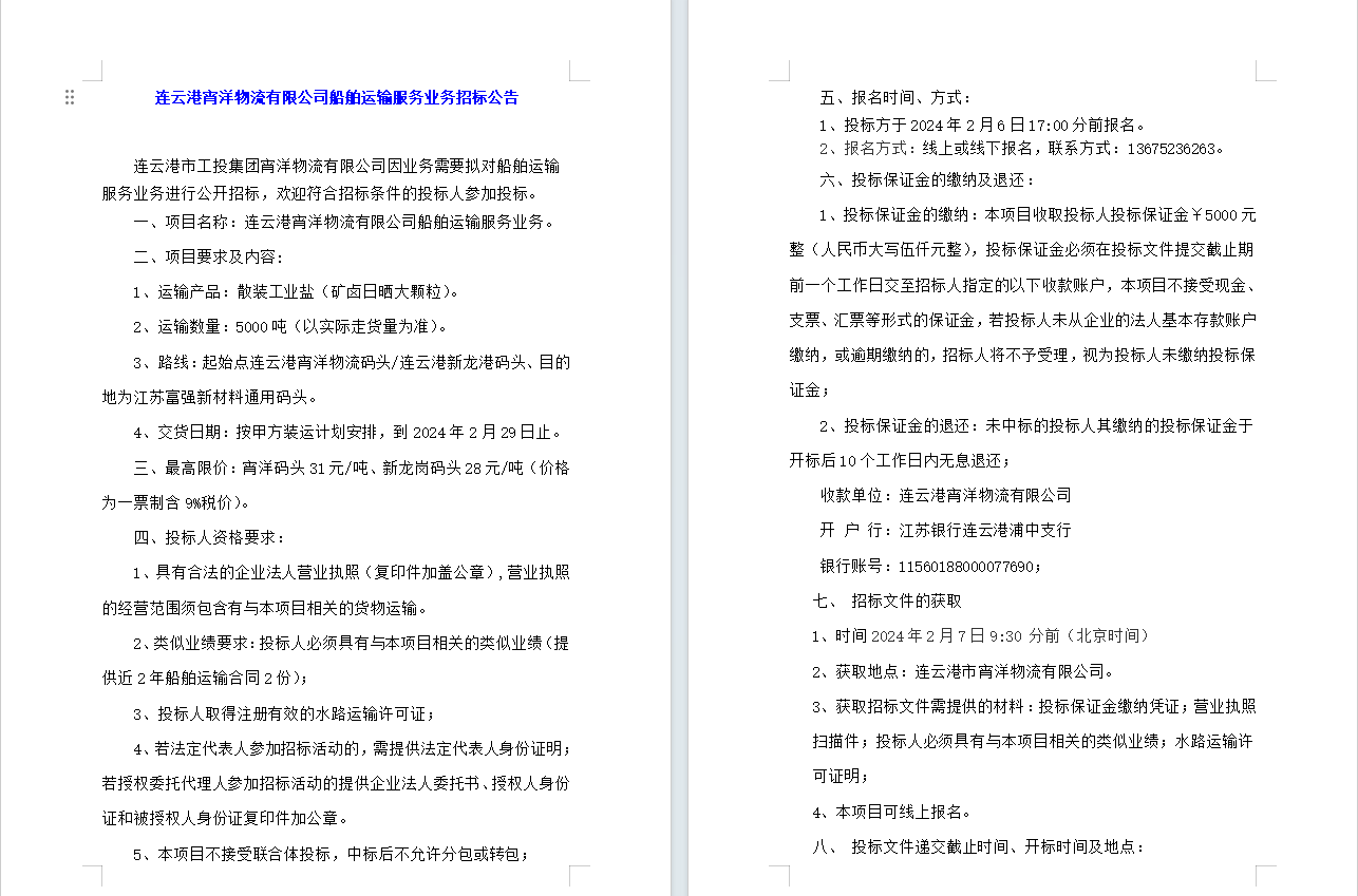 連云港宵洋物流有限公司船舶運輸服務(wù)業(yè)務(wù)招標(biāo)公告