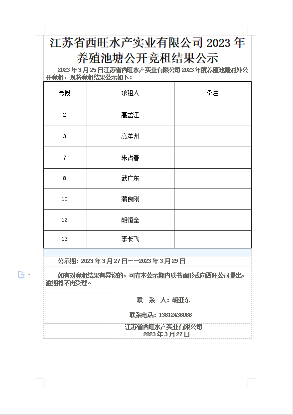 江蘇省西旺水產(chǎn)實(shí)業(yè)有限公司2023年養(yǎng)殖池塘公開(kāi)競(jìng)租結(jié)果公示