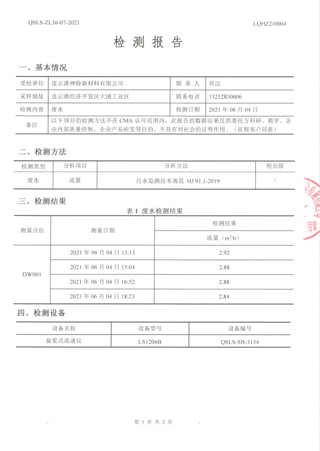 神特公司檢測報告公示