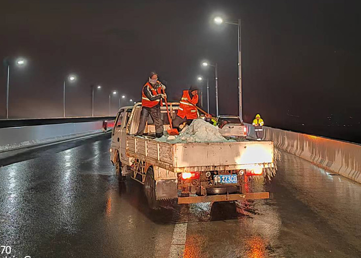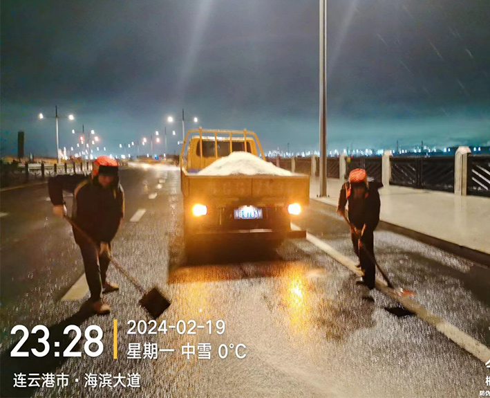 該公司迅速啟動(dòng)突發(fā)天氣應(yīng)急保障預(yù)案,近30余名道路應(yīng)急排險(xiǎn)突擊隊(duì)員,在公司統(tǒng)一按排下 ,裝車備運(yùn)融雪鹽斤近15噸,現(xiàn)場(chǎng)工作中隊(duì)員們士氣高漲,無(wú)所畏懼。夜間8時(shí)左右,10余名黨員先鋒,兵分三路再次安全有序奔赴燒香河、海濱大道、228等路段橋梁,無(wú)懼大風(fēng)夾著冰雨顆粒吹打臉頰,兩人一對(duì)、三人一組、揮動(dòng)手中鐵銑,汗水與冰雨濕透橙色衣衫,經(jīng)過(guò)近4個(gè)多小時(shí)努力奮戰(zhàn),人工撒放融雪鹽斤近20余噸,高質(zhì)高效保障近30座橋梁安全通暢。